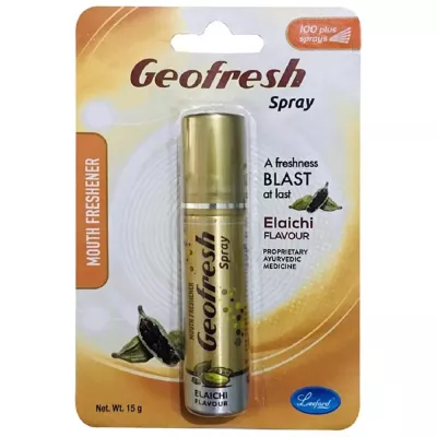 Leeford Geofresh Mouth Freshener Spray Elaichi Flavour: Cardamom-flavored mouth freshener spray, refreshes breath instantly, convenient for travel.