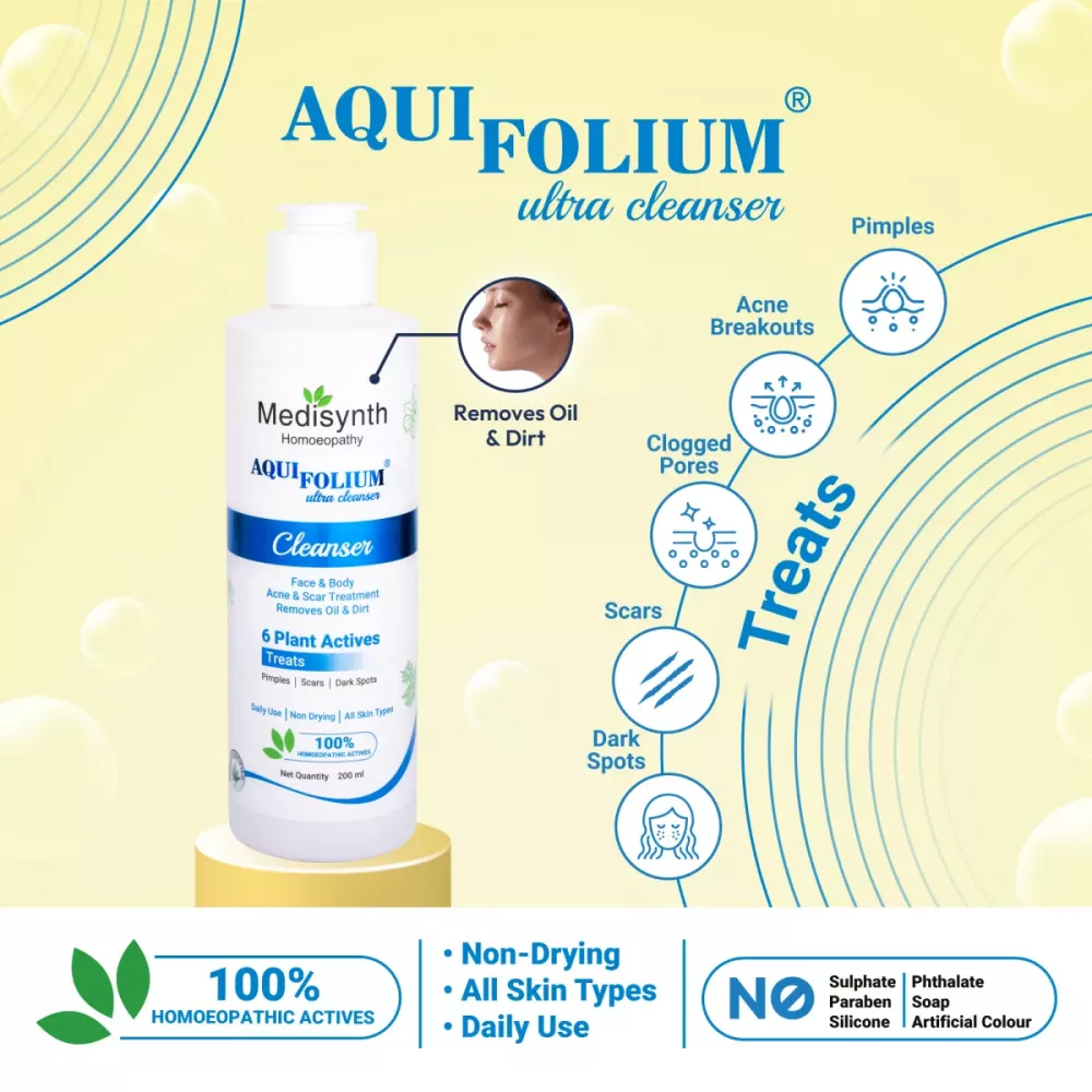 Medisynth Aquifolium Ultra Cleanser is a gentle face cleanser that cleans the skin deeply while keeping it soft. It has homeopathic ingredients like Berberis Aquifolium that help remove extra oil, dirt, and impurities from the pores, leaving your skin fresh, clean, and clearer.
