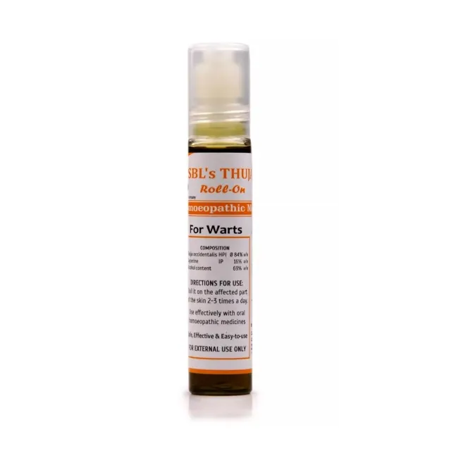 SBL Thuja Roll-On is a homeopathic roll-on preparation designed to provide relief from warts and skin growths. It contains key ingredients like Thuja Occidentalis, known for its efficacy in addressing these skin conditions. The roll-on format makes it easy to apply directly to the affected area without the need for additional tools or contact. SBL Thuja Roll-On is a convenient and hygienic solution for individuals dealing with warts, corns, and other skin growths. It offers a natural and gentle approach to tackle these issues without the side effects or discomfort commonly associated with invasive treatments. It is suitable for individuals of all age groups and provides relief while promoting healthier skin.