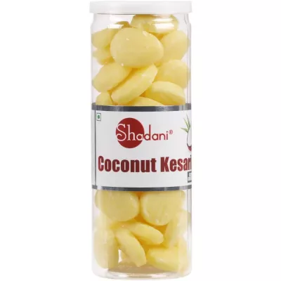 Shadani Coconut Kesri: Kesri (saffron) flavored coconut treat, sweet and aromatic, indulgent snack, provides energy and satisfaction.