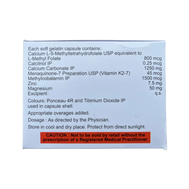 It contains a combination of Calcitriol (Vitamin D3), Calcium Carbonate, Methylcobalamin (Vitamin B12), Magnesium, Zinc, L-Methyl Folate, and Vitamin K2-7 (Menaquinone) to provide comprehensive bone support. Regular use of this supplement can also improve flexibility in the joints and promote stronger, healthier bones.